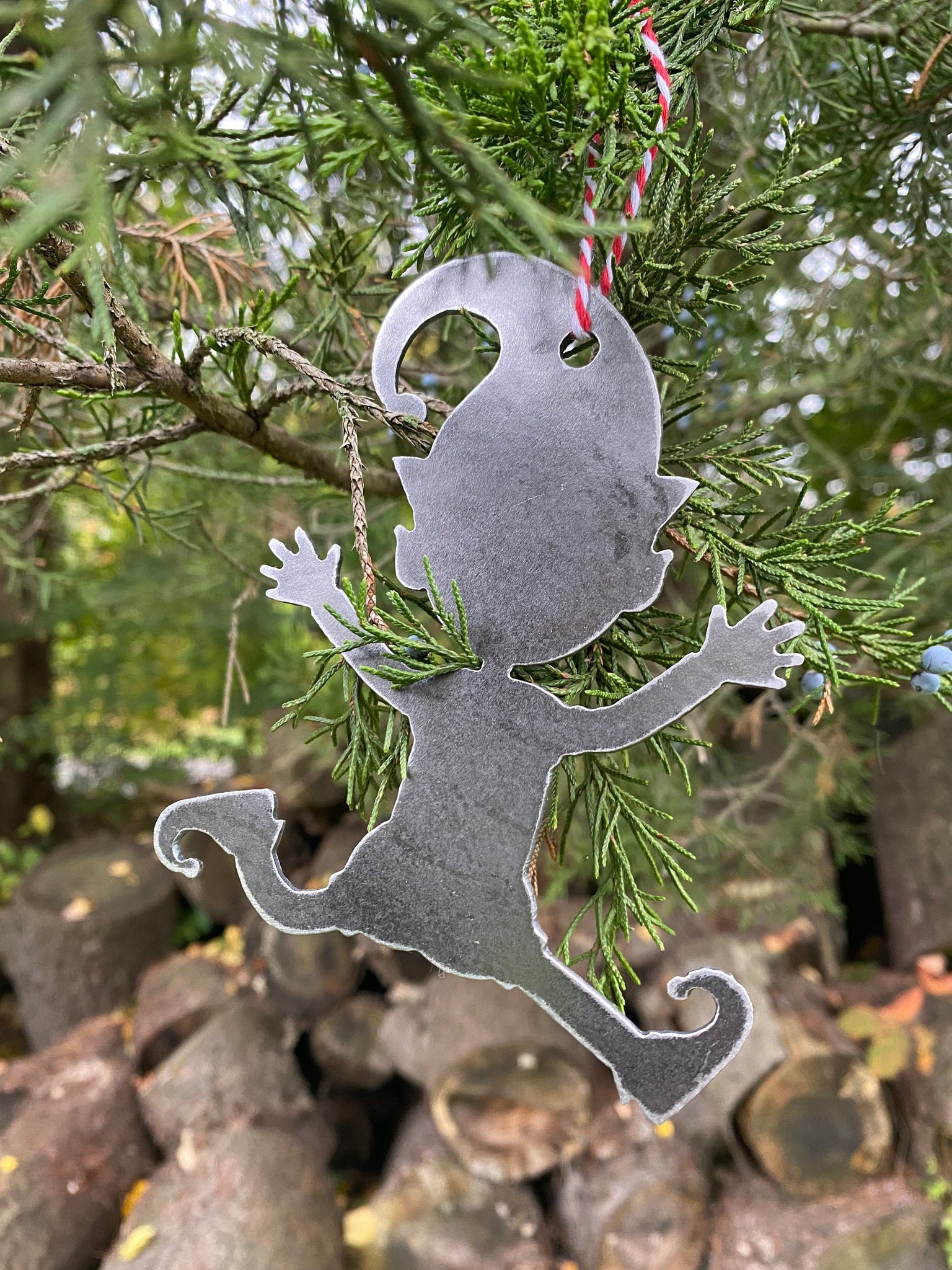 Set of three metal elf ornaments. Each elf is 5" tall. Each elf is hand made so metal finish will vary slightly.