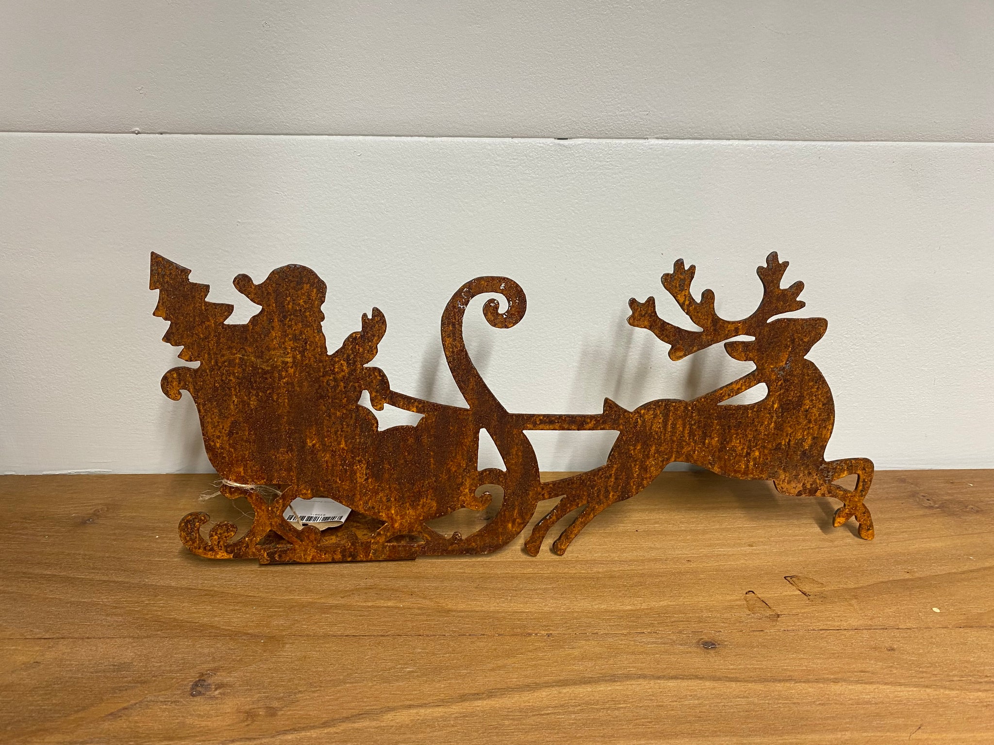 Santa and his reindeer shelf sitter comes in multiple size and finish options. pictured is the pre resulted finish. Final results may vary.