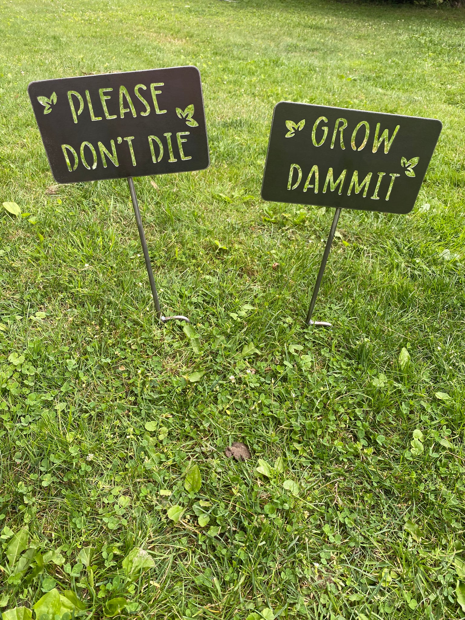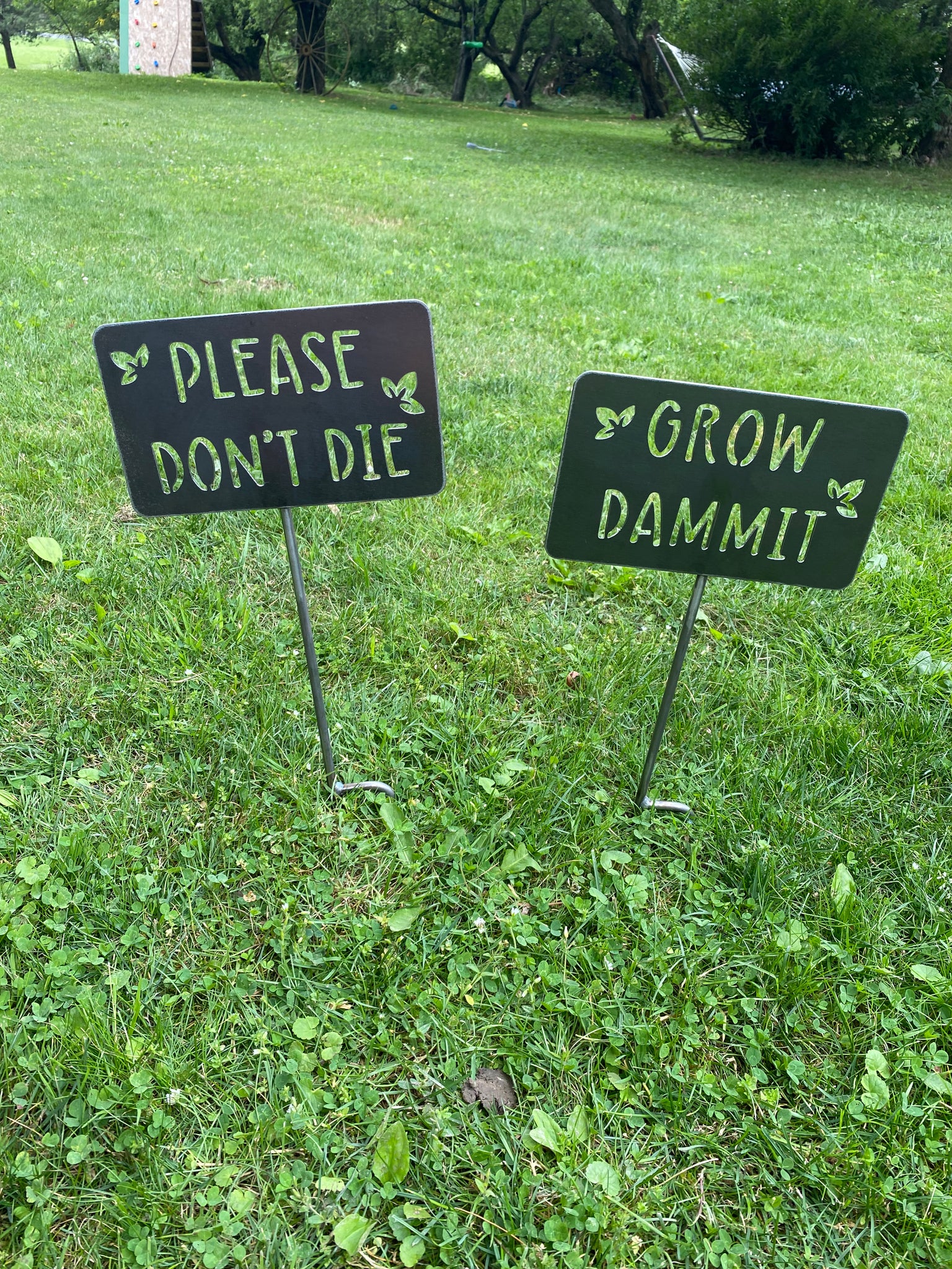 Give your plants some words of encouragement. Grow Dammit and Please don’t Die stakes are sold individually and as a set of 2. Signs are 9”x5.5” and a 12” stake. Select from multiple finish options. Raw metal will rust naturally over time. All other finishes are weather resistant.