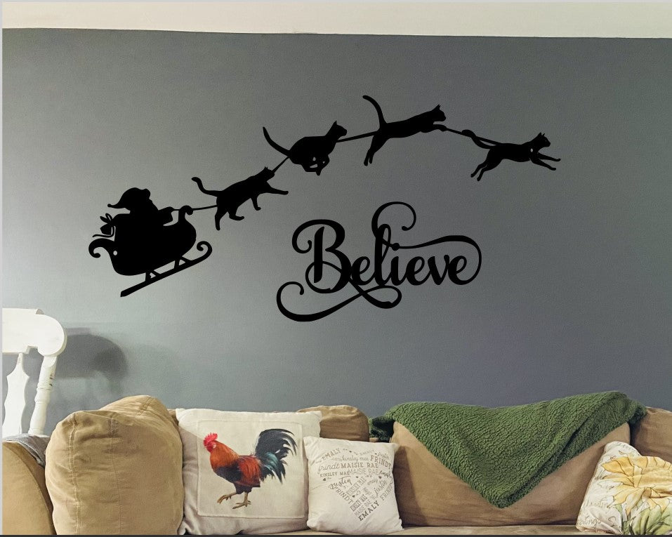 Bring festive charm to your holiday display with this whimsical Cat Sleigh metal art piece. Four playful cats take the reins of Santa's sleigh in this charming Christmas decoration that captures the magic of the season. Crafted with attention to detail, this metal art sculpture adds personality and warmth to any home or outdoor space. Available in multiple sizes to suit your décor needs and finished in various options to complement your existing aesthetic. A delightful conversation starter that celebrates the joy of the holidays with a creative twist.